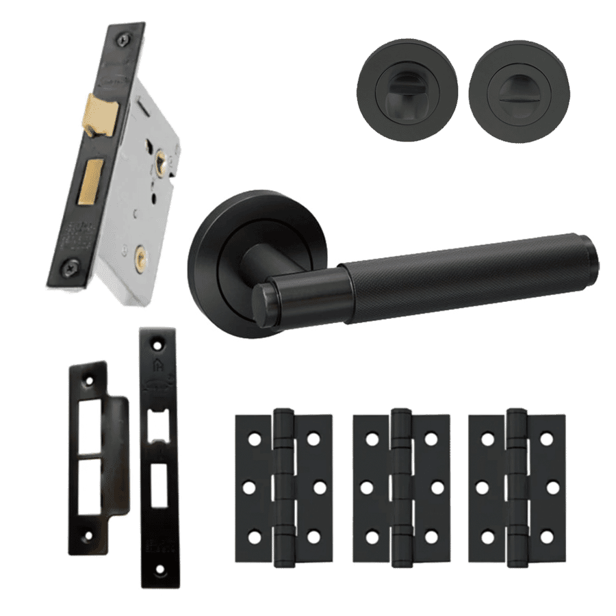 The Knurled internal matt black door handle packs come with three black 75mm colour matched butt hinges, the two handles and a 3″ latch. Also available in a privacy pack that comes with matching matte black thumb turn locks to suit. These Matt Black hardware packs are supplied to you at market leading prices, and available ex. stock, so they can be delivered with your doors in rapid delivery timescales.