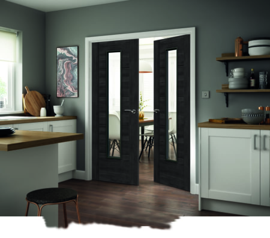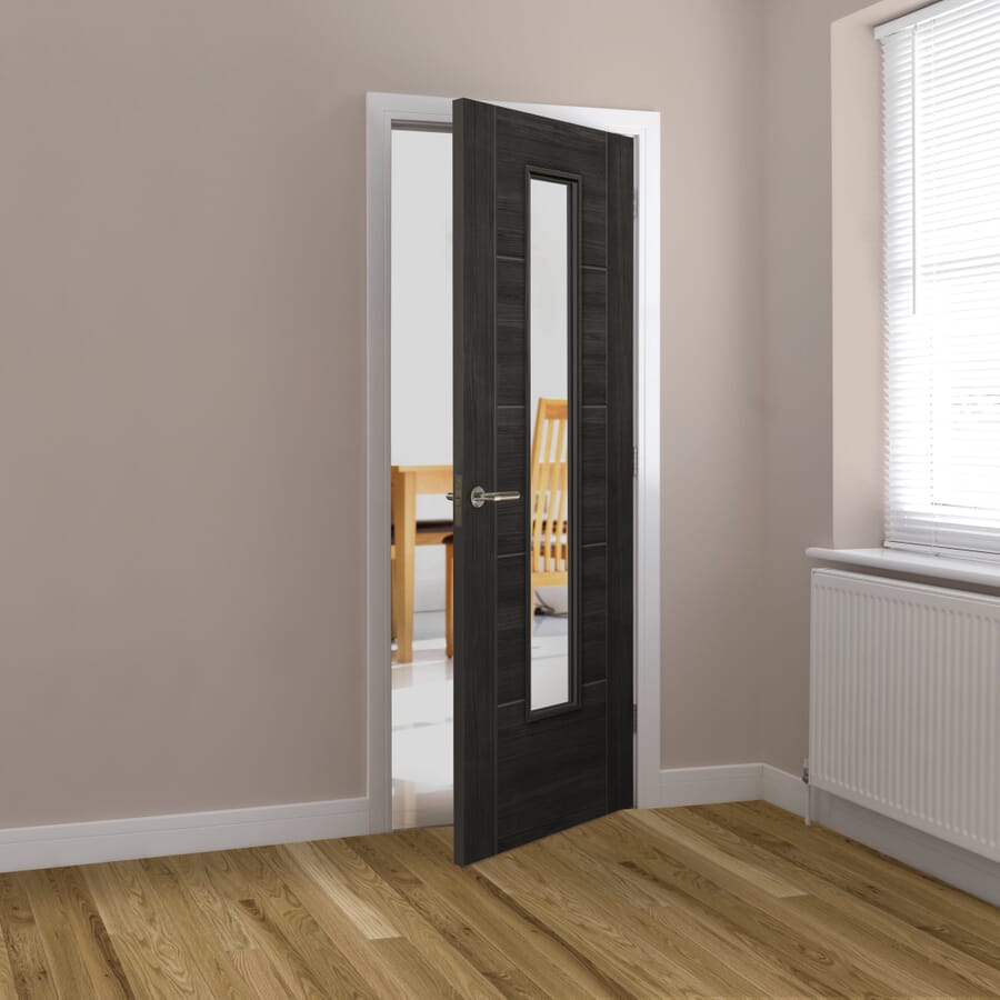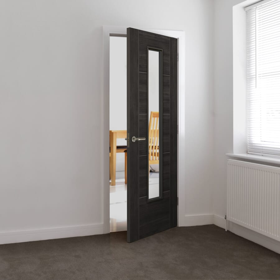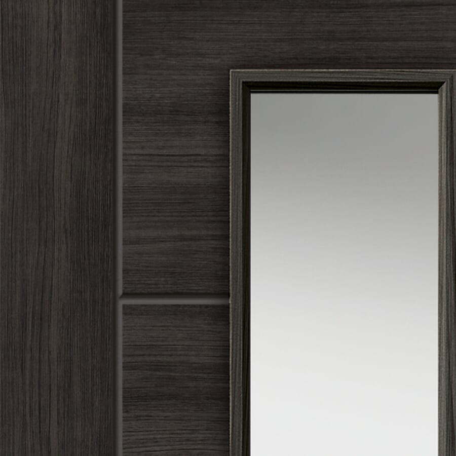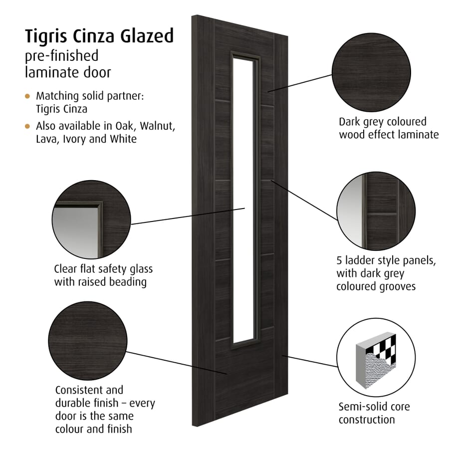 The new laminate Cinza Clear Glazed Tigris is a bold addition to the ever expanding Tigris offering from JB Kind. With its five panel design, semi-solid construction, and single pane of clear glass, this door is not only extremely sleek but available at an affordable price too! Why not have a look at the Tigris Cinza Panelled option too? This door’s sleek 1L design it allows for natural light to flow from room to room, without losing that timeless Tigris 5P Ladder design. The Tigris Cinza with Clear Glass Internal Door is stocked in 35mm standard, but can be supplied in 44mm FD30 Fire Rated – please email for a quotation.
