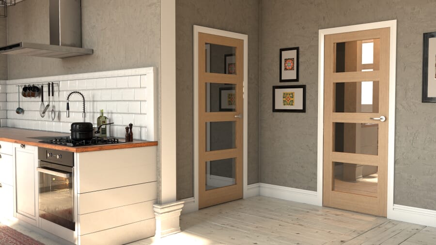Saving you time and money these Oak Shaker 4L Clear Glass Fully Finished are ready to hang as soon as they are delivered. The clear lacquered factory finish ensures a long life whilst enhancing the natural grain you expect from quality Oak doors. The full range of Climadoor doors includes panelled, frosted and roomfold options allowing you replace every door in your home.Each door is made from engineered wood with top quality real oak veneers.All doors 27″ (686mm) and over have a solid 18mm lipping and doors 24″ (610mm) or less have 10mm lippings.