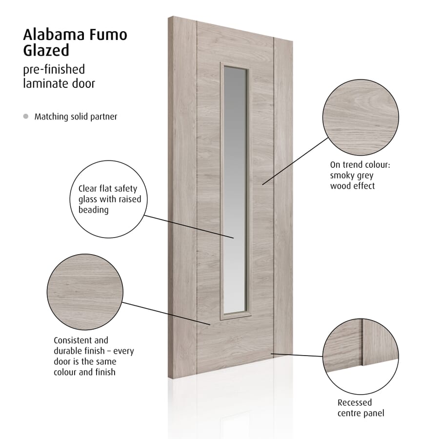 Contemporary laminate with smoky grey wood effect – central panel is slightly recessed. Clear flat safety glass with raised beading. Uniform finish makes it ideal for matching. This door benefits from a semi-solid core construction allowing it to be both sturdy and cost-effective.