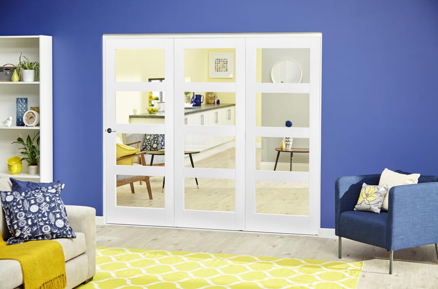 Internal bifold doors are becoming increasingly popular in the UK, as are the use of 4 light glazed doors in more contemporary households. These white primed shaker style 4 light doors are supplied complete with toughened clear glazing. These doors are ready for finishing on site to a colour of your choice so an ideal solution for those with painted doors. This roomfold set can be trimmed by 50mm in height ( proportionate to the rail depths ), and by 50mm for a 3 door system (10mm off each side of the frame and 10mm off each door ), and a further 10mm per door for sets with more doors.
